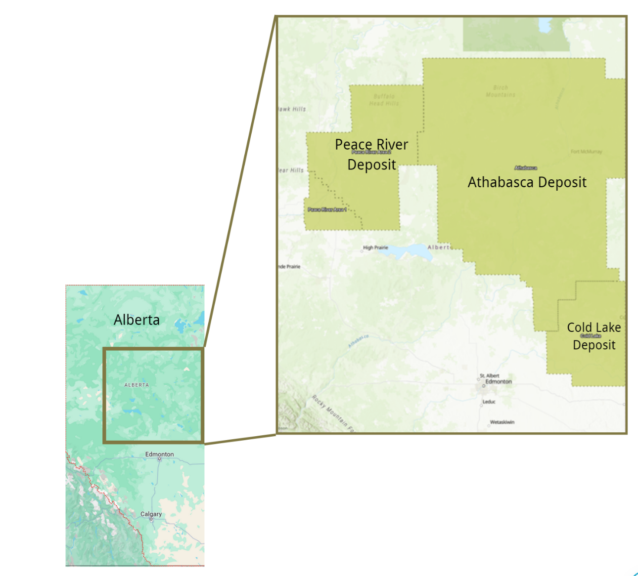 the location of three main oil sands deposits in the Province of Alberta. Created by Corrine Yu 2024, using Google Maps and ArcGIS Pro.